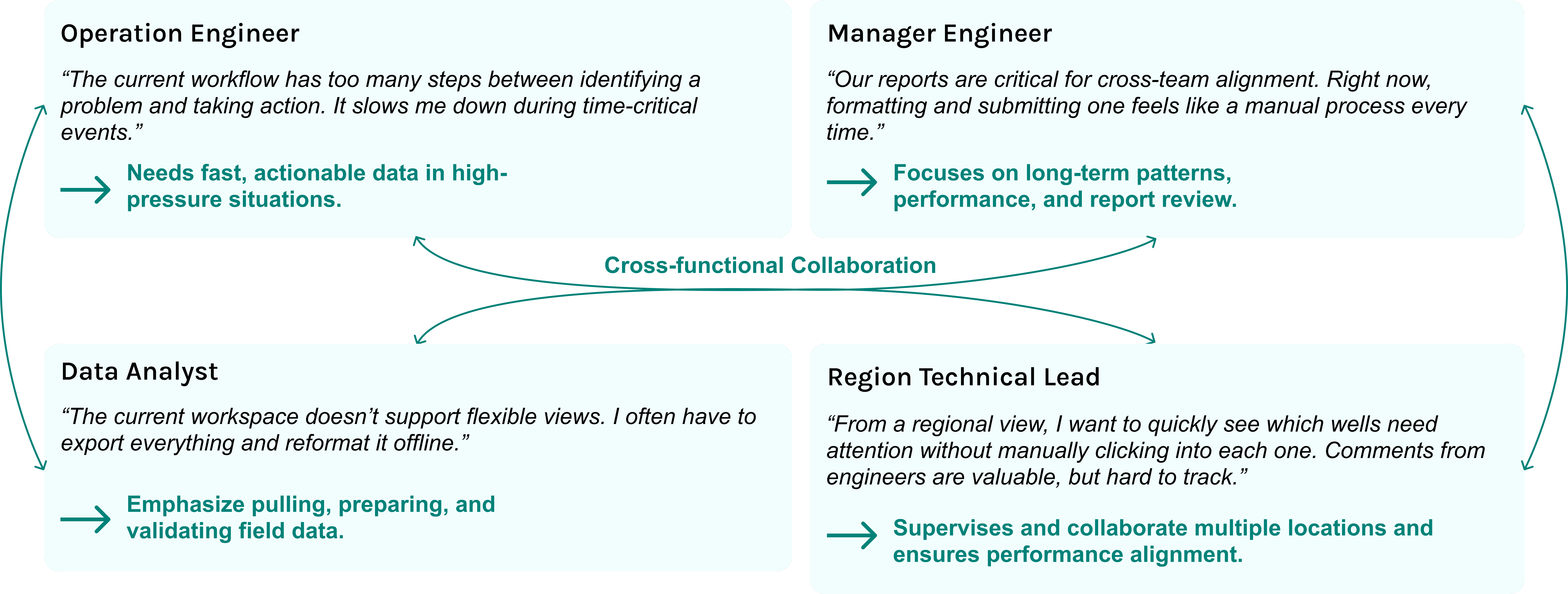 After conducting 12 stakeholder interviews across daily users of the system, including operation engineer, manager engineer, data analyst, and region technical lead, we found the most representative issues occurring in the current user experience and system, summarized as pain points: